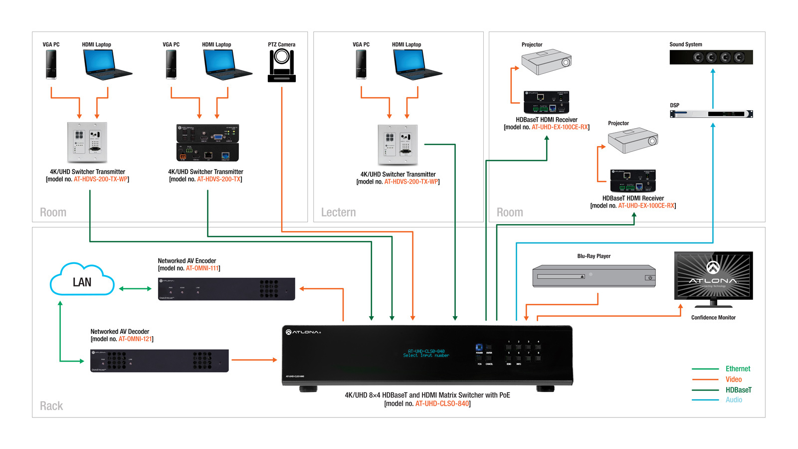 Divisible rooms require AV system flexibility to accommodate various room configurations and meeting applications. AV integration solutions need to support multiple screens simultaneously, connectivity in multiple locations for presenter devices, and additional AV functions that may include enterprise-wide broadcasts, teleconferencing, or presentation capture.
