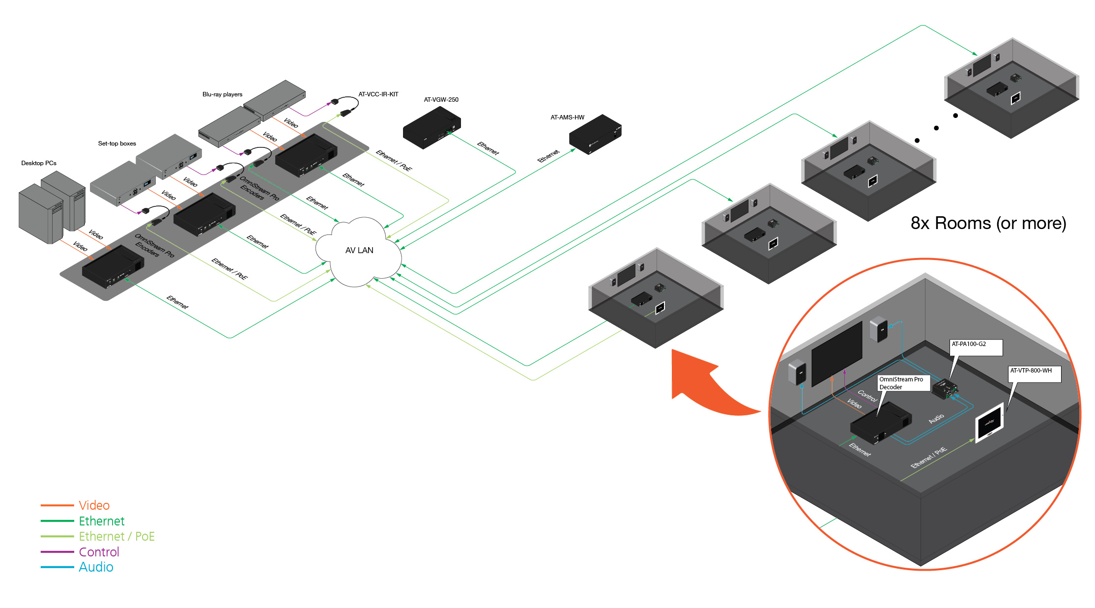 Atlona OmniStream™ is a flexible, scalable, and cost-effective AV distribution platform for meeting rooms, residences, retail establishments, corporations, and even a campus or enterprise. OmniStream delivers the performance and dependability of traditional AV distribution, plus the unrestricted scalability and cost efficiency of integrating over data networks.